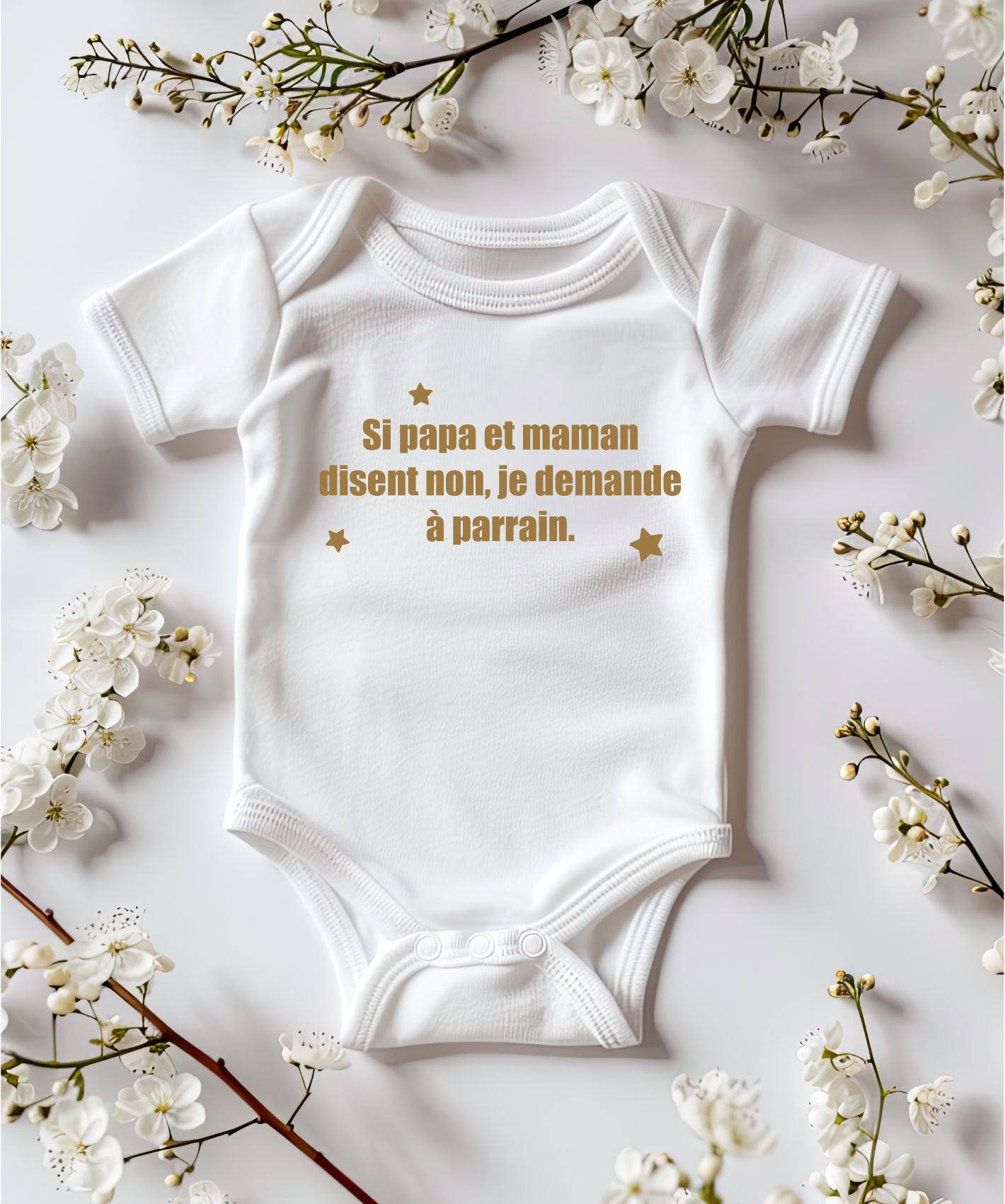 Offrez un moment plein d’émotion au futur parrain 💙 Ce body bébé tout doux révèle un message tendre et inoubliable : « Si papa et maman disent non, je demande à parrain » Un cadeau original et profondément touchant pour annoncer l’arrivée d’un petit-enfant. Parfait pour créer une émotion forte et graver à jamais la réaction du futur parrain.