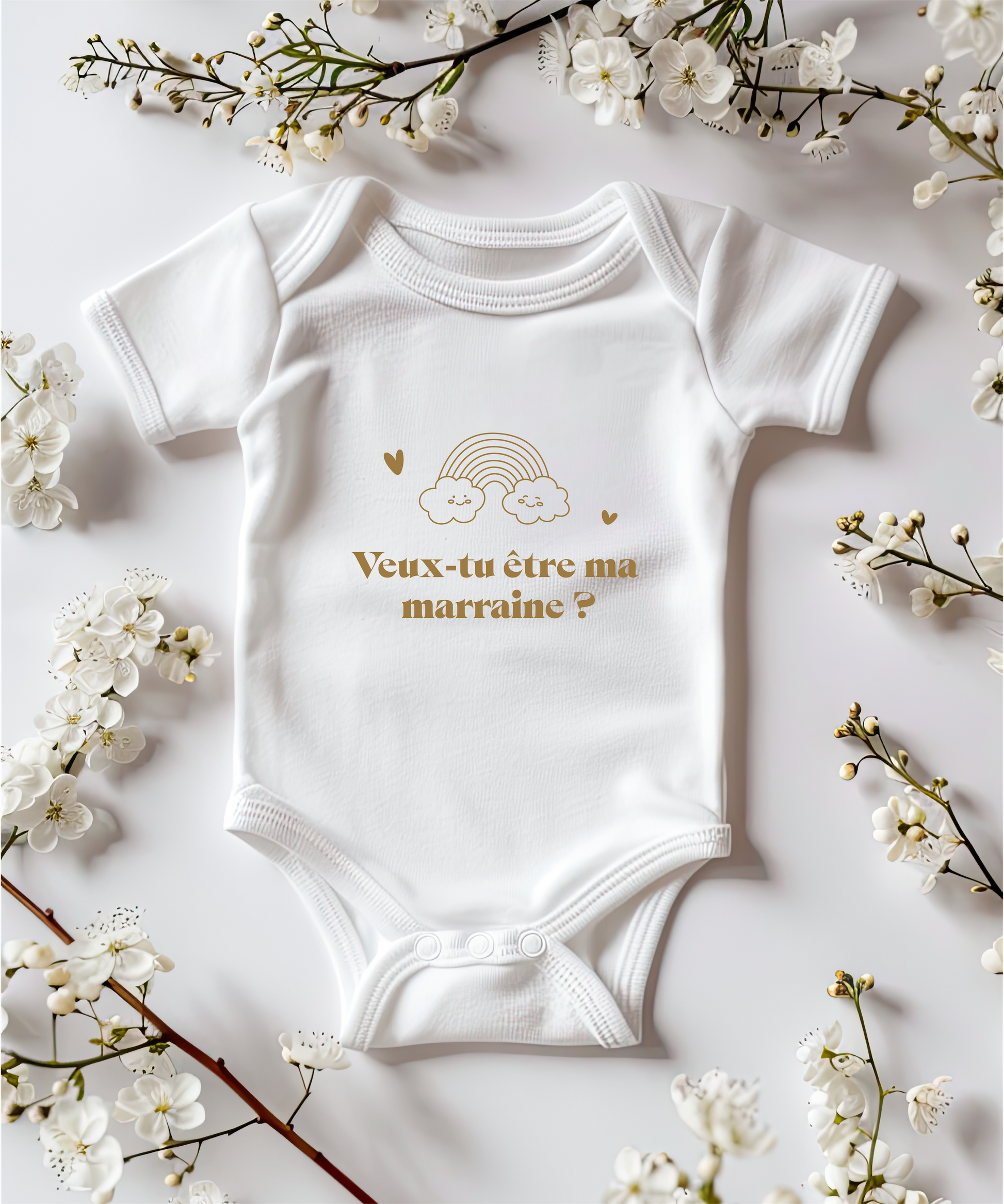 Offrez un moment plein d’émotion à la future marraine 💙Ce body bébé tout doux révèle un message tendre et inoubliable : « Veux-tu être ma marraine ? » Un cadeau original et profondément touchant pour annoncer l’arrivée d’un petit-enfant. Parfait pour créer une émotion forte et graver à jamais la réaction de la future marraine.